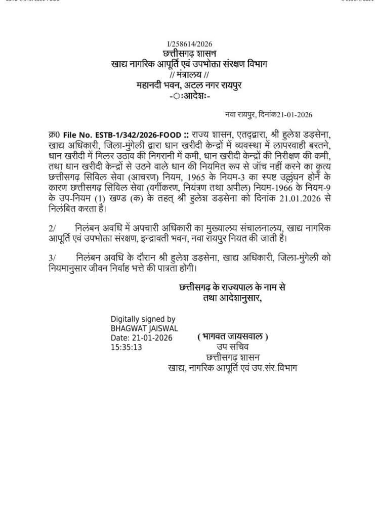 धान खरीदी व्यवस्था में गंभीर लापरवाही को लेकर राज्य शासन ने बड़ी प्रशासनिक कार्रवाई की है। मुंगेली जिले के जिला खाद्य अधिकारी हुलेश डड़सेना को निलंबित कर दिया गया है। यह कार्रवाई धान खरीदी केंद्रों की अव्यवस्था, मिलर उठाव की निगरानी में भारी चूक और नियमित निरीक्षण नहीं किए जाने के आरोपों के बाद की गई है।