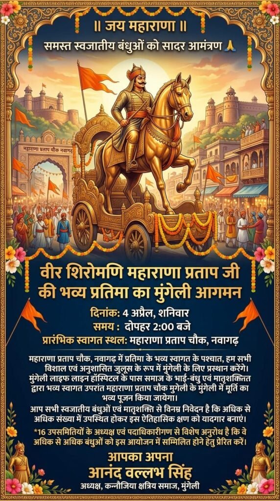 मुंगेली – नगर के सामाजिक और सांस्कृतिक इतिहास में 4 अप्रैल का दिन एक स्वर्णिम अध्याय के रूप में दर्ज होने जा रहा है। इस दिन नगर के प्रमुख स्थल पड़ाव चौक में शौर्य, वीरता और स्वाभिमान के प्रतीक महाराणा प्रताप की विशाल प्रतिमा का भव्य आगमन होगा महाराणा प्रताप की विशाल मूर्ति की स्वागत बेमेतरा से होते हुए नवागढ़ फिर मुंगेली जिले के टेमरी में और फिर लाइफ लाइन हॉस्पिटल के पास मुंगेली में भव्य स्वागत की तैयारी की जा रही है ।